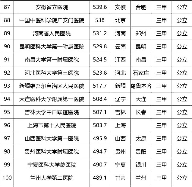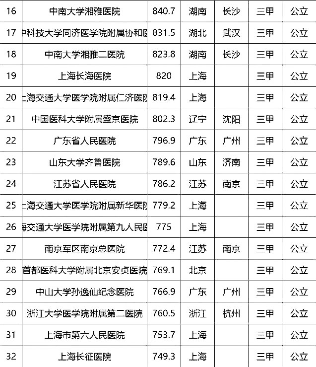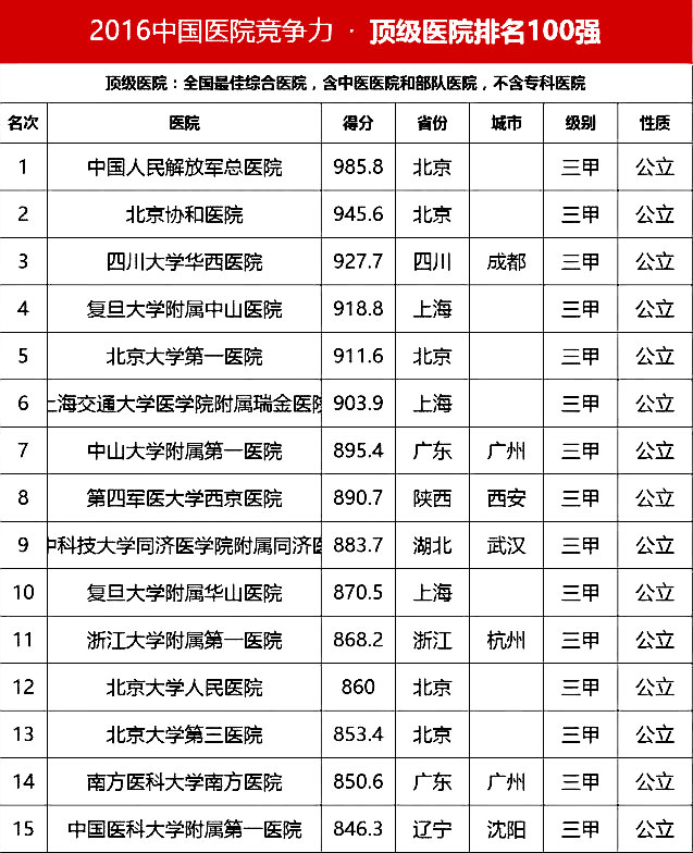 2016中國頂級醫(yī)院100強榜單出爐